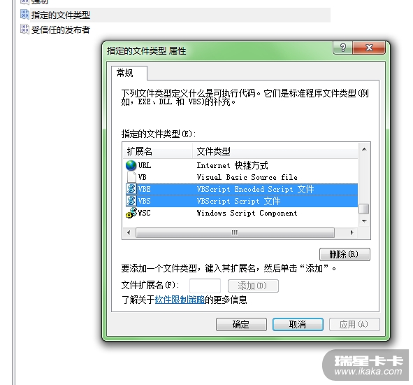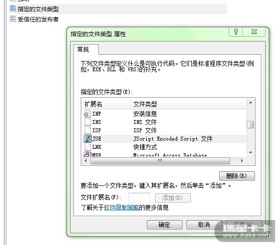 (1)在“软件限制策略”的“指定的文件类型”中添加VBS、VBE、JSE(图4-图5)