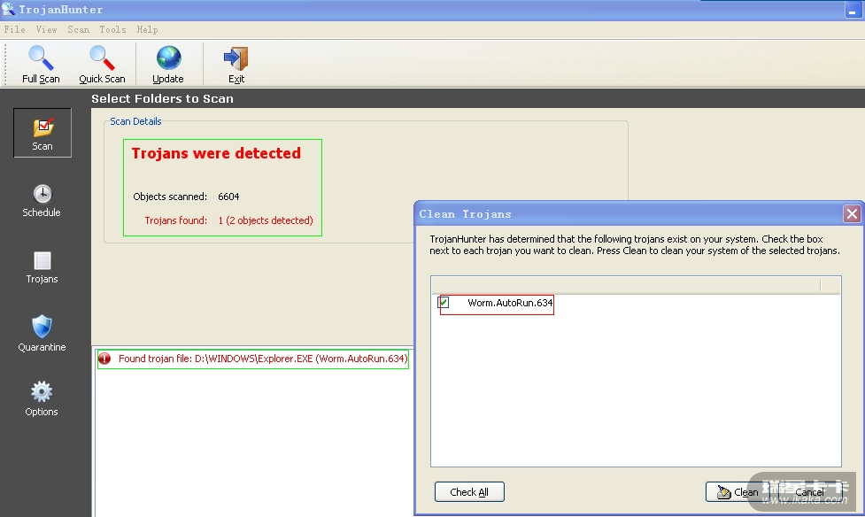 Found trojan file: D:\WINDOWS\Explorer.EXE (Worm.AutoRun.634)