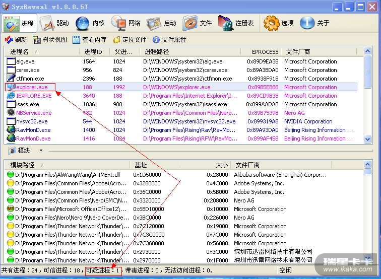 用瑞星、Windows清理助手没有查出, 使用TrojanHunter5.3查出并清理后桌面图标都没有,重启后病毒又被复制.