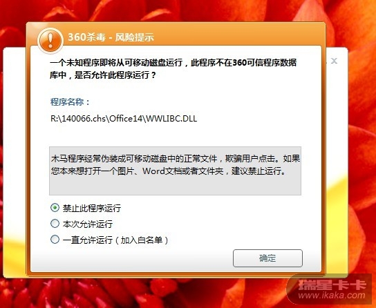 一个未知程序即将从可移动磁盘运行,此程序不再360可信程序数据库中,是否允许此程序运行: