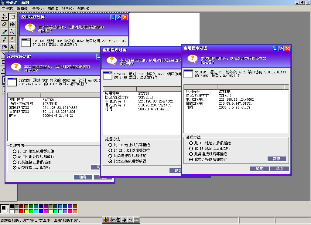 我机器刚刚用HJ扫描的结果,今天SYSTEM又出现了访问网络问题了,今天一刚开机就连续出现了5个,都被我的费尔防火墙拦截下来了!下边有我的截图!