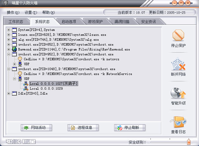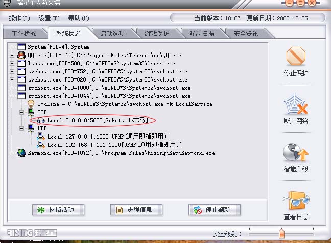 PS: 当时用的是QQ2005珊瑚虫版,瑞星杀毒2006为18.07.20 防火墙为 18.07