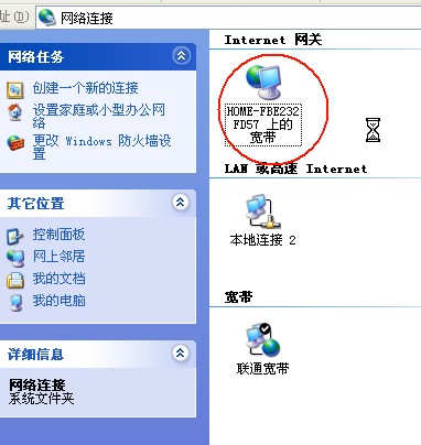 我是一个联通宽带用户,最近发现一个奇怪的现象:启动计算机后,经常会自动产生一个“HOME-FBE232FD57上的宽带”连接,(我自己的连接叫联通宽带),如果打算断开这个连接,则显示“Internet连接共享计算机没有配置为允许网络用户控制或禁用共享的Internet连接。此设置可以在Internet连接共享计算机上的共享连接的“高级属性”中更改”,根本无法断开它。这时居然可以浏览网页(但我并未打开“联通宽带”)。图片见附件
