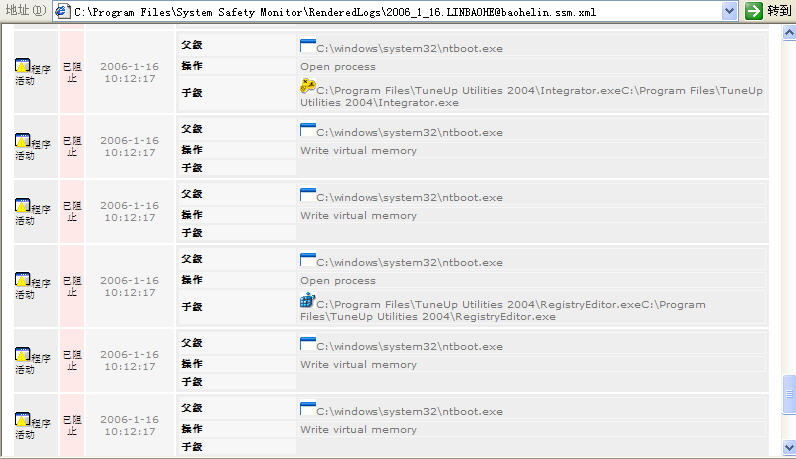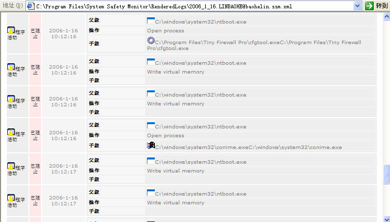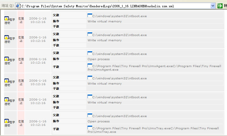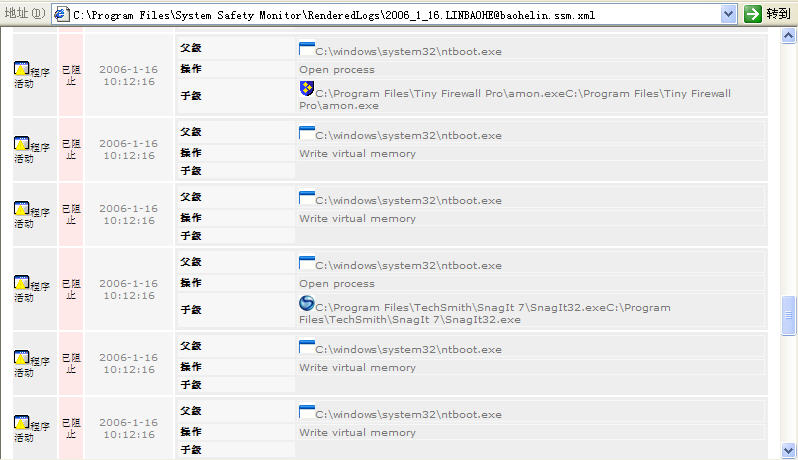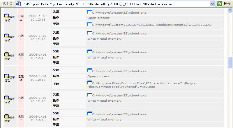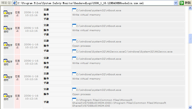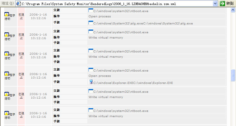 Byshell067不仅插入spoolsv.exe,而是插入多个系统关键进程,如:winlogon.exe、services.exe、smss.exe、csrss.exe、lsass.exe。此外,它还动态插入应用程序进程。下面8幅截图是SSM拦截其各种感染动作的日志,够BT!!