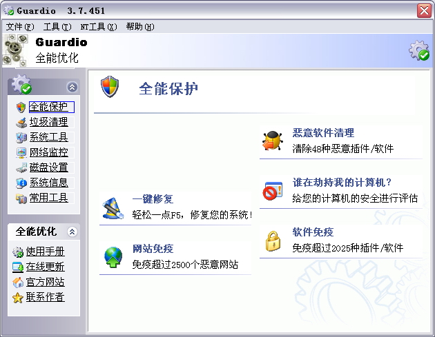 全面保护和优化您的计算机!全面杀除超过30,000种木马/恶意软件,免疫国内外2025种恶意插件/软件/网站,清除48种恶意软件,去除68种系统/常用软件使用痕迹,清除IE的访问历史和Cookies,个性化系统(120个)和IE(76)、全面增强IE、网络连接管理、局域网管理和安全信息,更可全面管理自动启动软件、Windows进程和服务、删除已安装软件等!