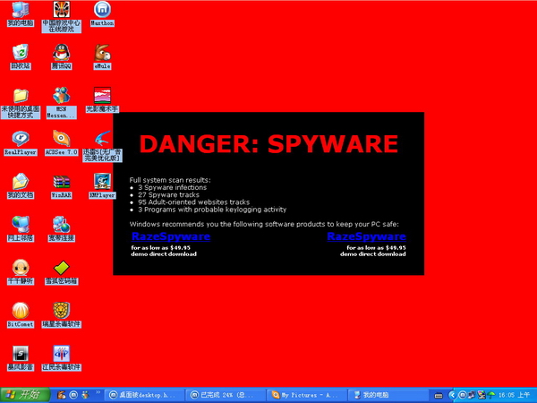 我的电脑今天出现点问题,桌面被不明图片给覆盖.红底,中间有个小框里面有一些英文如下: