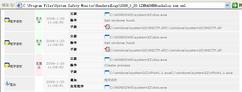 dos.exe在%system%下创建VPort1.1.exe;并试图插入msctf.dll和msctfime.ime。TPF2005及SSM均未监测到注册表改动,HijackThis及Autoruns日志也无异常发现。以dos.exe为关键字,搜索整个注册表——无果。以Vport1.1.exe为关键字,搜索整个注册表——无果。重启系统后发现:dos.exe自动加载运行,但dos.exe试图运行VPort1.1.exe时被SSM阻止(见附图)。此时,dos.exe和VPort1.1.exe可被直接删除。