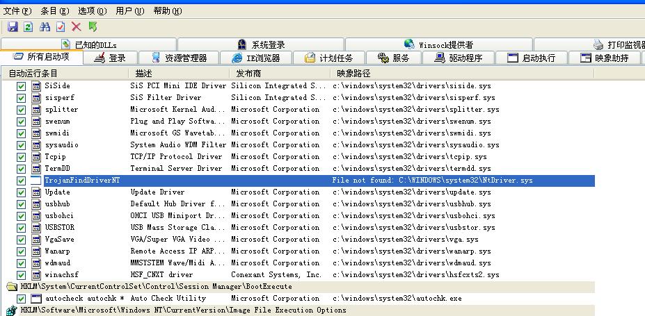 用AUTORUNS将那项TrojanFindDriverNT去掉(相应的文件已经丢失了)。