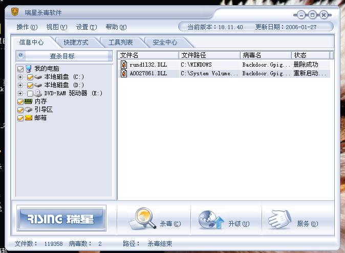 各位大大,小弟现在有个麻烦,用2006最新更新连杀N遍,每次都能杀出一个病毒--rund1l.dll,显示为灰鸽子的变种,杀是能杀掉,可是从新开机后又有了!用了论坛上大大写的安全模式下找_hook.dll的办法也不行,找不到目标文件,就一个SYSTEM32里的DLL...