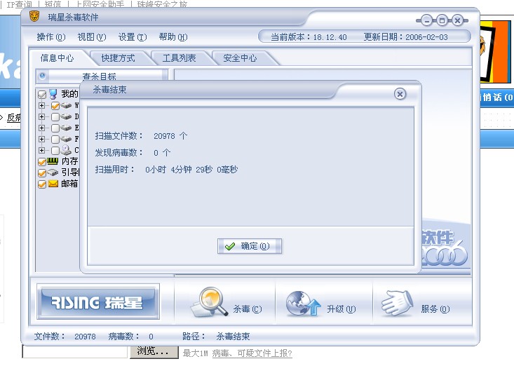 上面说的Windows Access就是我的W32Tasks.删除后.重启电脑,删除了C:\WINDOWS\system32\taskman32.exe后.用瑞星杀毒!!删除了几个文件后,重启电脑,再用瑞星杀,发现以下图片!!!同志们!!杀鸽子的时候到了