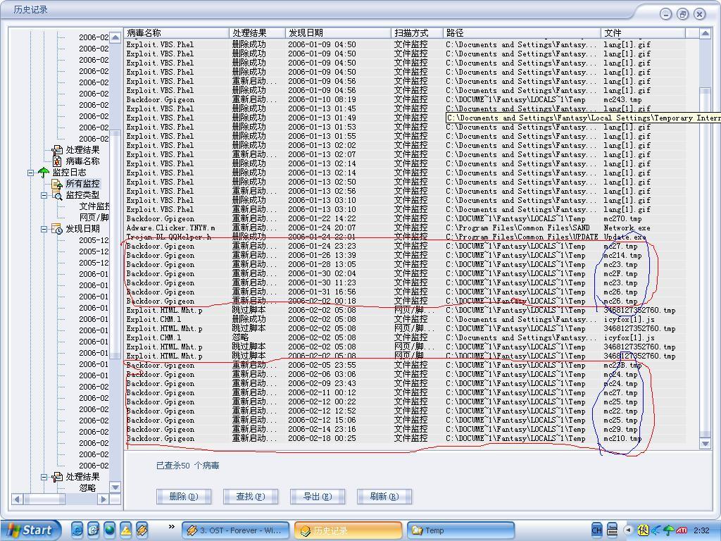 这个病毒(就是画圈的那些)是在启动街头篮球是出现的,每一次都出现两次,第一个我按杀毒,按后就出现第二个,(也是一样的)这次就不能杀毒了,只能选择删除或忽略。我当然次次删除了。但每次删后还是会出现,而且大家看后面,他还换了个名字(就是MC XXX)我该怎么办?请高手帮帮我,那到底是什么病毒?而且不知道是否跟我几天前发的贴所反映的问题有关。这是那帖的连接http://forum.ikaka.com/topic.asp?board=3&artid=7796890这是瑞星的杀毒日志。那病毒的扩展名是tmp,到底是什么来的?