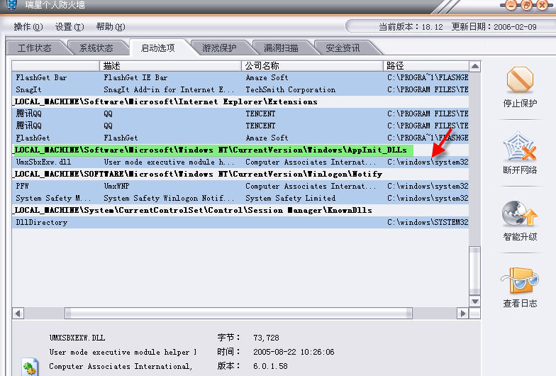 瑞星2006防火墙可以看到AppInt_DLLs项下相应文件的路径(看图)