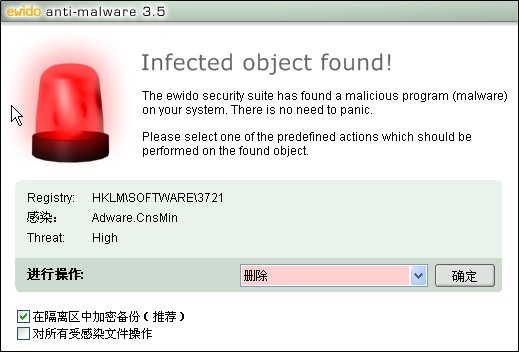 4、当ewido发现威胁存在时会发出警报,请选择处理方式,然后按“确定”;