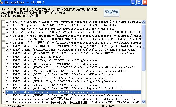 但是,在安全模式下找不到O4 - HKCU\..\Run: [update8] C:\Program Files\Internet Explorer\lib\aupdate.exe和O4 - HKCU\..\Run: [supervisor.exe] C:\WINDOWS\supervisor.exe
