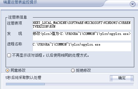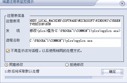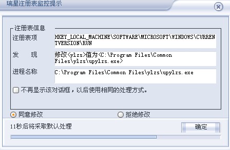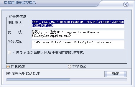 每次自动启动,修改注册表(瑞星监控)不同意修改就一直弹直到死机,朋友帮帮忙看哈是什么东西?谢谢