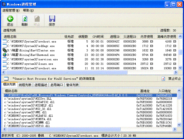 我用优化大师进程管理器查处该进程有一项列表路径在C:\WINDOWS\WinSxS\x86_Microsoft.Windows.Common-Controls_6595b64144ccf1df_6.0.0.0_x-ww_1382d70a