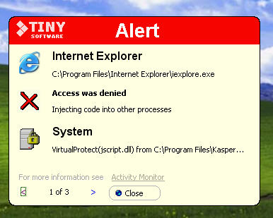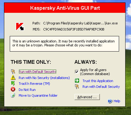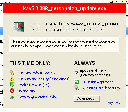 如果是升级了kaspersky后,出现这种现象,请点击“trust this application”。如果反复出现这个提示,请右击任务栏中tiny的图标,点击“Update Known Applications”,更新一下kaspersky的MD5即可。