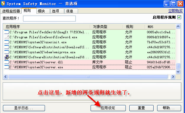 规则添加完后,务必点击面板下方的“应用设定”(图4)。否则,你就瞎忙活了!