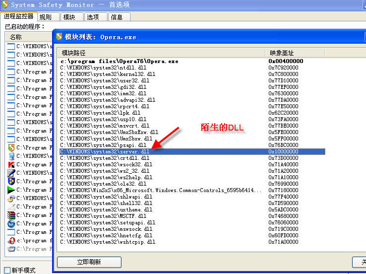 这个后门运行后,SSM并不能发现其文件创建、注册表改动等行为。但是,SSM的进程列表中可发现异常的浏览器进程和异常DLL模块加载(图1)。我用OPERA浏览器,但此时,OPERA并未打开。