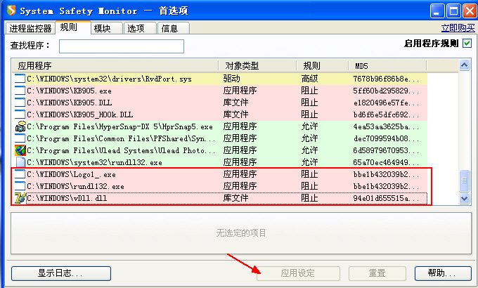 1、自己动手,在SSM“规则”中添加三条规则(见图1红框),禁止病毒程序运行。