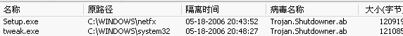 trojan.shutdowner.ad。。。这病毒。。我格式化系统盘都没用。。每次开机都有。。。不管是慢格。。块格,,,我都想死了。。。怎么办啊。。现在每次开机都特慢。。。我用瑞星杀完。。。下次还有。。。我到处查这个毒资料。。哪里都没有。。什么白度。。百度上只有两条没用的链接;.google上没有任何东西。。。。。。55555555555555555555555555555555555555555555555