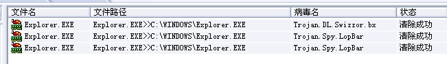 小弟我昨天不知道为什么,中了Trojan.DL.Swizzor.bx和Trojan.Spy.LopBar 这两个木马,瑞星在每次开机的时候,就提示查出此木马病毒,而且此木马是镶嵌在Explorer中,我用过很多方法,比如木马克星,木马杀客,等多款专杀木马的软件,都不能将这木马彻底删除,所以现在不知道哪位高人能够指点下,这木马怎么这么顽强,到底用什么方法才能把他彻底删除呢?如果有什么方法,请高人详细解释下,另外附图一张,请高人指点,谢谢拉~