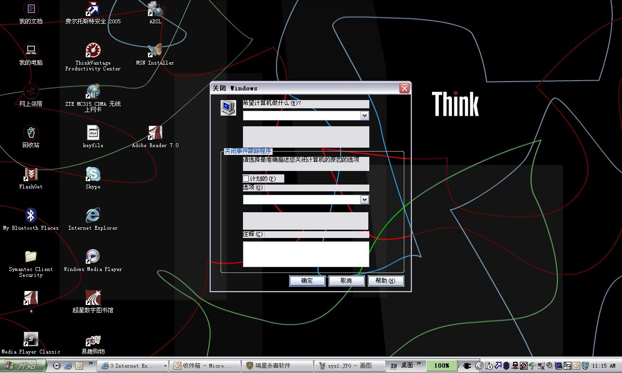 2。关机时出现的画面如图2,点确定/取消按钮都没反应,点X关掉画面后再点关机,这时的画面就正常了;在出现开始---〉运行画面也会出现这种情况;