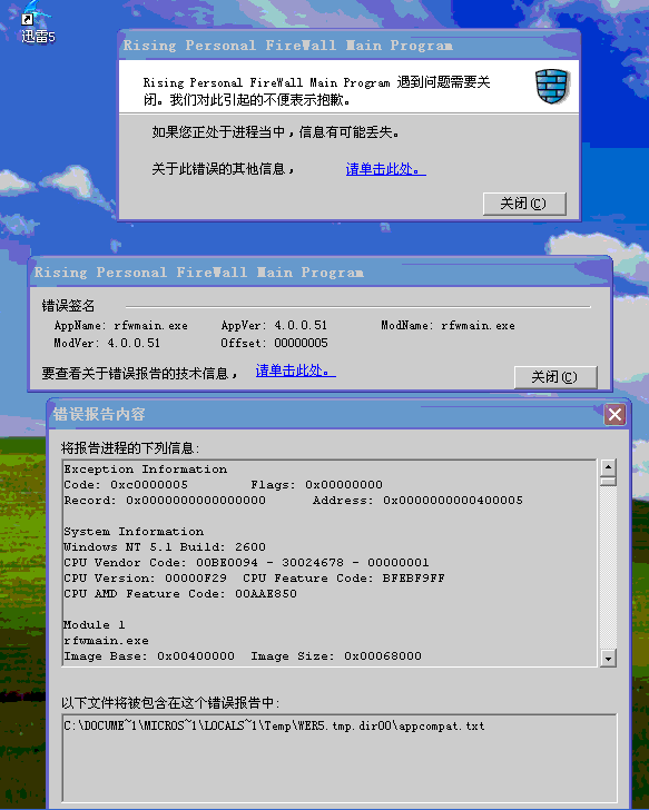 一点击快捷方式就提示“Rising Personal FireWall Main Program遇到问题需要关闭。我们对此引起的不便表示抱歉”。