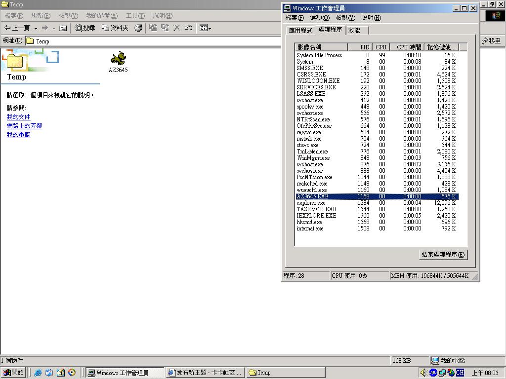在系统进程里有莫名其妙的进程,我在c:/winnt/temp  发现这个.exe文件用ProcessView杀掉这进程,重启后又会出现一个,只是名字改变了。