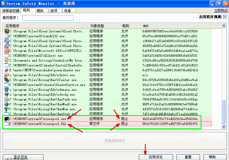 1、在SSM的“规则”中添加规则,禁止system32下的winsspool.exe和winsspool.dll运行(图1)。