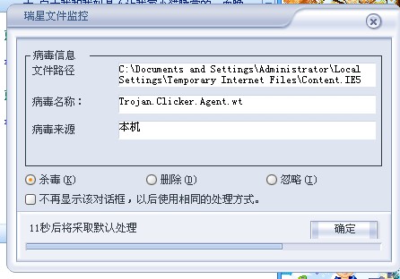我一开IE,就自动弹出小框框提示有病毒“Trojan.Clicker.Agent.wt”~~我点杀毒或者删除都没用,下次开IE还会同样出这个。。。我用瑞星杀毒,扫描不到。我找到那文件夹定点杀毒,也杀不到。下次开IE照样会出。。。怎么办- -救下命吧。。帖几个图可能清楚点。~我不会弄日志- -就帖图吧~
