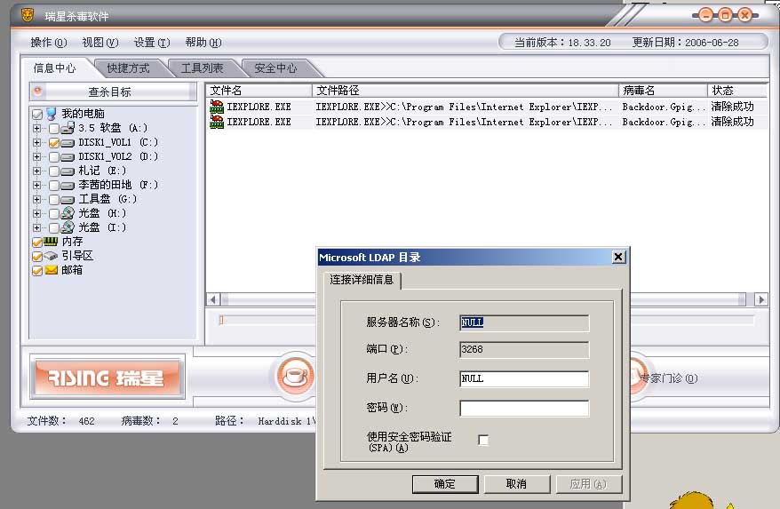 另外在瑞星查到第个Backdoor.Gpigeon.uql病毒的时候就会跳去个对话框,而且杀毒程序暂停,我截了张图,图片如下,我点击取消,或是确定,杀毒才会继续.