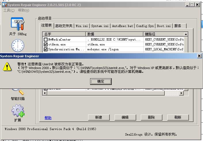 System Repair Engineer 发现默认的键值被修改成非默认值,且这个键值经常被计算机病毒修改,那么会弹出一个警告提示提醒用户注意。