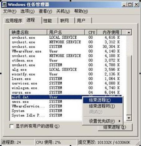 1、 检查本机的“ ARP 欺骗”木马染毒进程, 同时按住键盘上的“ CTRL ”+“ ALT ”+“ DEL ”键,选择“任务管理器”,点选“进程”标签。察看其中是否有一个名为“ MIR0.dat ”之类的进程。如果有,则说明已经中毒。右键点击此进程后选择“结束进程”。