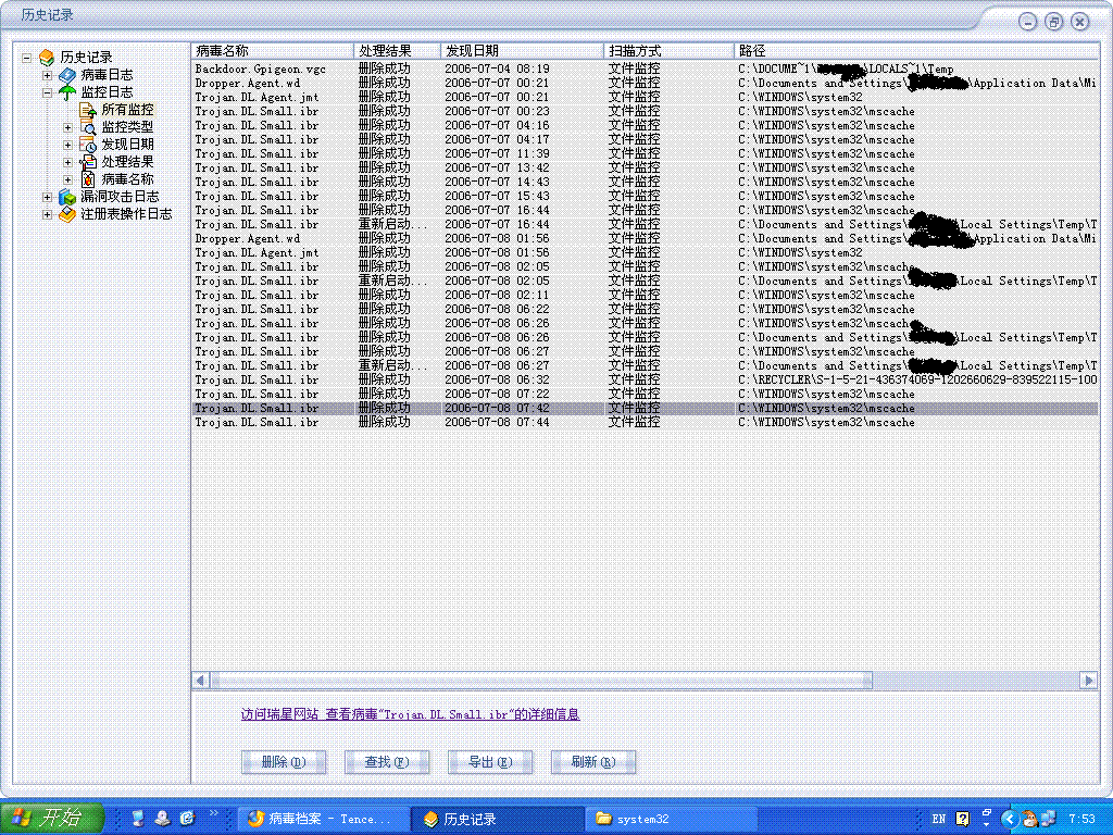 问题症状:病毒Trojan.DL.Small.ibr无法彻底清除--每次显示删除成功,但重启机器后又在相同目录查杀到,如此循环。病毒路径:C:\WINDOWS\system32\mscache\ 病毒文件:*.cpz>>cf.scr 处理结果:删除成功