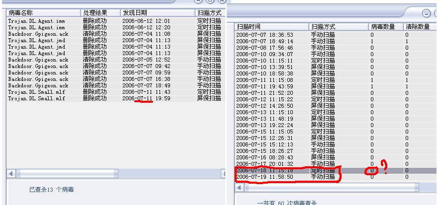 我想说的是,我在历史纪录里面怎么看不到这个病毒的呢?瑞星显示有刚才两次的杀毒记