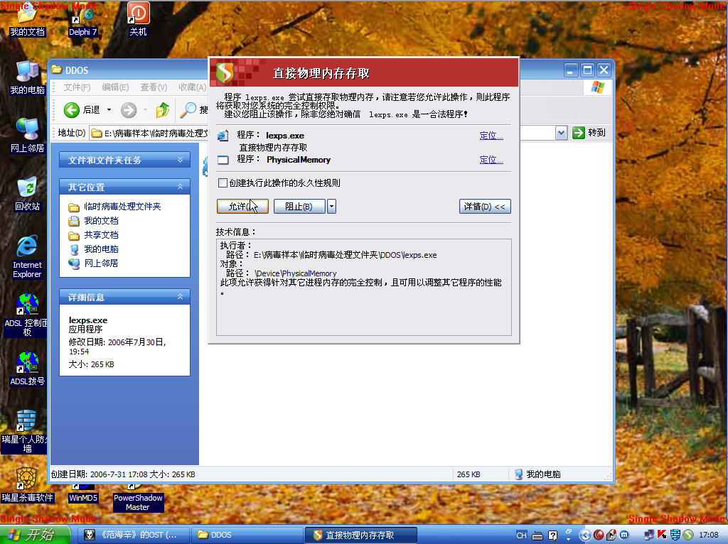 根据baohe版主回帖补充:如果发现有调试器或者安全软件拦截它的行为,它会自杀以不被发现.(我测试时用SSM除了访问物理内存是禁止的,其它一律放行,它才没自杀.)