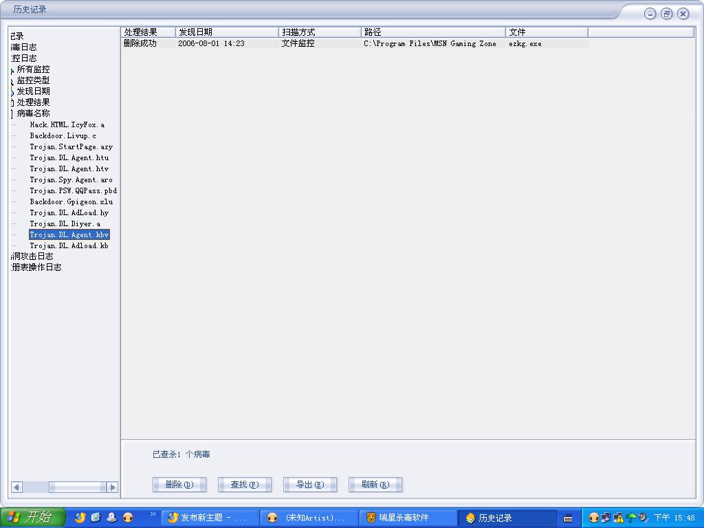 下午中了个病毒,名为Trojan.DL.Agent.kbv ,用瑞星查杀,显示删掉了,可是打那以后,上网时就打不开“我的电脑”,“回收站”,“我的文档”等可以进硬盘的图标,而且,上网时速度变慢,在安全模式下查杀(瑞星最新版),显示没毒,我都快疯了,谁能救我呀?!!!!!!!!!!!!!!!!!!