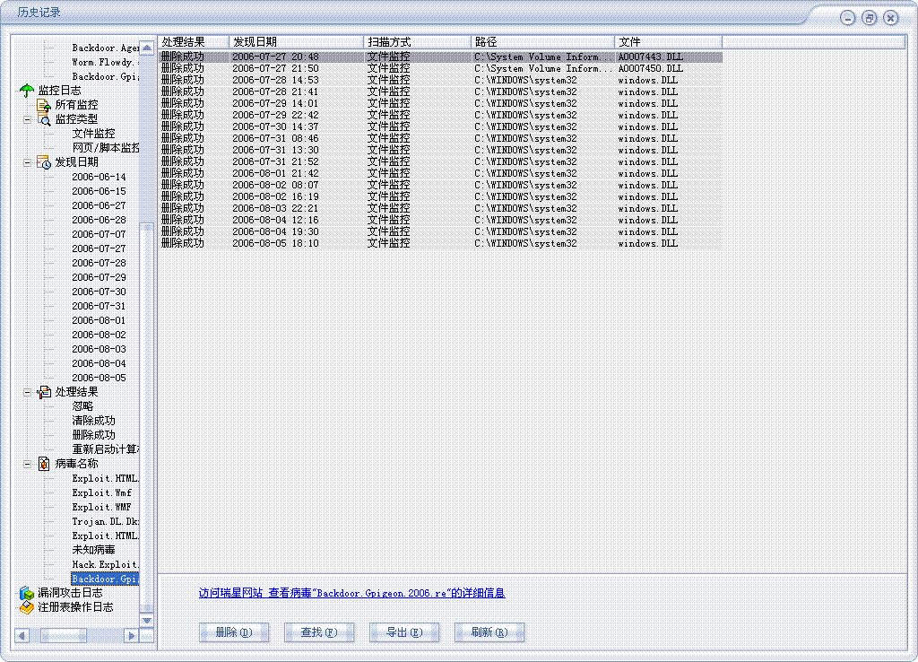 删除成功2006-08-05 18:10  文件监控  C:\WINDOWS\system32  windows.DLL