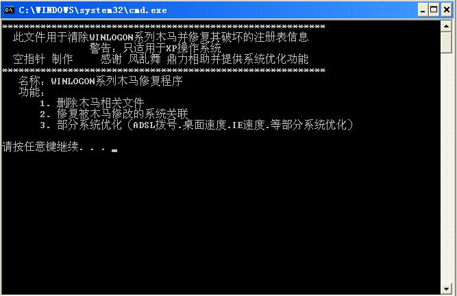 将进程结束后,运行WINLOGON.bat(需要事先下载下来,建议直接放在桌面上,以免打开我的电脑时再次激活病毒),按照提示操作即可。依次进行的是去掉文件s  r  h属性,删除文件,修复注册表信息。在后面提供了风乱舞的系统优化功能,可以根据个人喜好选择是否优化。