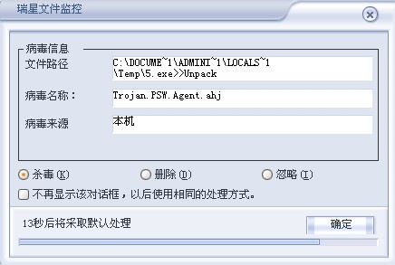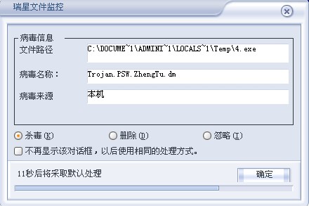 还有,瑞星监控没隔几分钟就会提示一下分别发现Trojan.PSW.ZhengTu.dm和Trojan.PSW.Agent.ahj病毒,选择了杀毒、也选择了删除,怎么还是要提示啊??