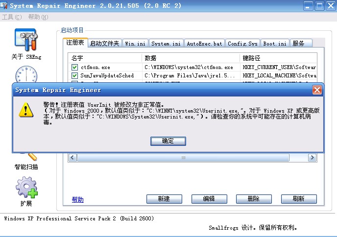 运行(双击)System Repair Engineer,使用“启动项目,注册表”选中要修复的项C:\WINDOWS\system32\userinit.exe点“编辑”在“值”里改为C:\WINDOWS\system32\userinit.exe,
