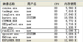 本人是菜鸟以前进程:rundll32.exe这个进程是不占CPU的。。前天中了个病毒,手工删除了。今天看了下发现这个进程却老是占10-20%的CPU不知道是不是受病毒感染了。。用卡巴扫了又没发现有病毒。希望高手指点下,小弟在这先谢谢了。另附上日志