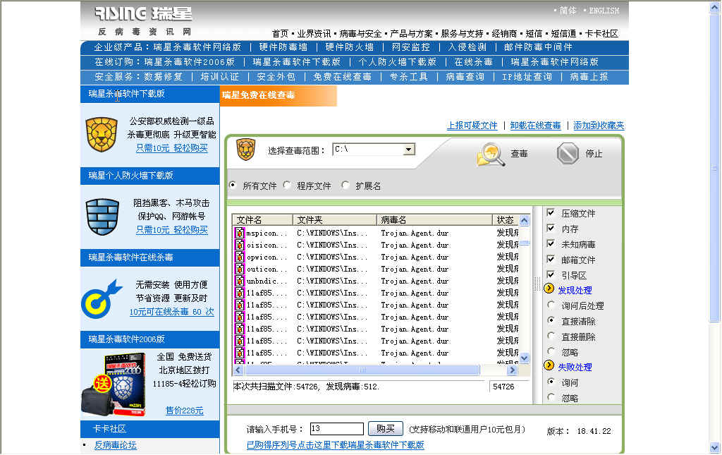 各位大侠帮忙拉,我昨晚用在线查毒查出许多Trojan.Agent.dur,而我的电脑上装的瑞星是05升级到06版的,病毒库是2006.8.23号,查不出任何病毒来,怎么回事阿?怎么杀毒阿?