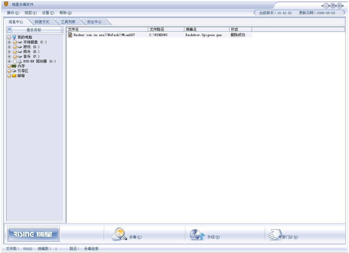 Backdoor.Gpigeon.gen 删除成功 手动扫描C:\WINDOWSHacker.com.cn.exe>>NsPack>>Mian007本机