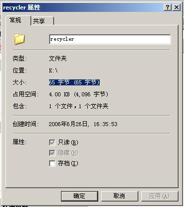 我用的是金山:病毒 2006-08-29 20:31:36 发现病毒在文件K:\RECYCLER\RECYCLER\autorun.exe中 Worm.Delf.aj.47104 处理成功(操作:删除)
