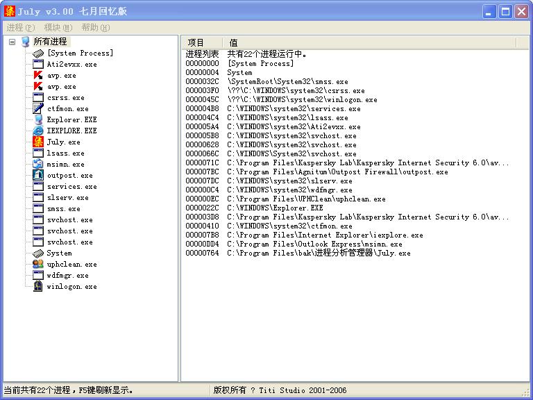 在您打开July之后,您将看到一个类似于Windows资源管理器的界面。窗口左边的树形视图列出了当前的所有进程,右边的列表视图显示的是当前选定项的信息,即进程的ID、模块等。