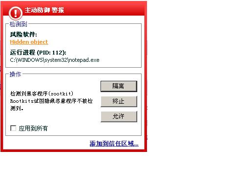 已检测到: 风险软件 Hidden object    运行进程: C:\WINDOWS\system32\notepad.exe