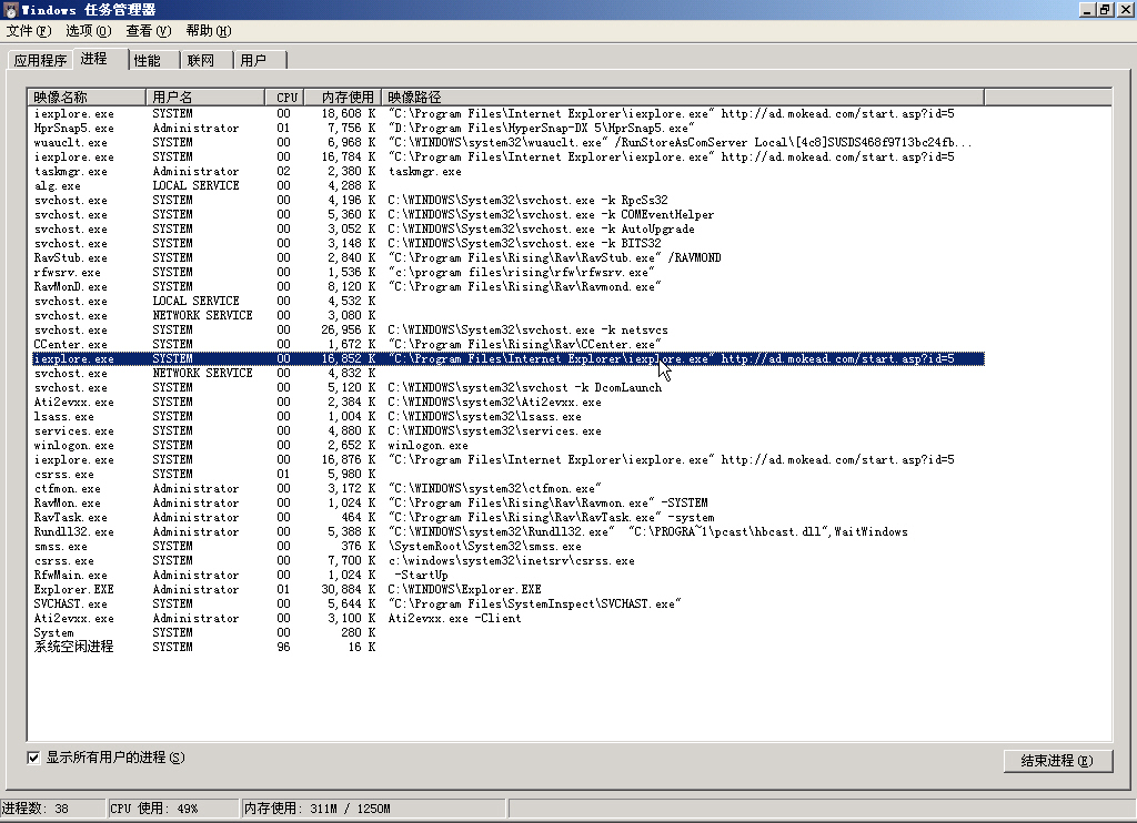 表现症状为:开机后自动打开IE浏览器,打开网址为http://ad.mokead.com/start.asp?id=5,在进程中表现为,“C:\Program Files\Internet Explorer\IEXPLORE” http://ad.mokead.com/start.asp?id=5,且呈间歇性连续出现。