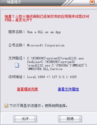 防火墙的提示则是一个流氓软件造成。用超级兔子卸载之。
